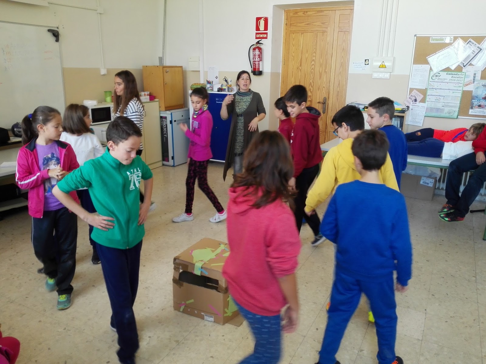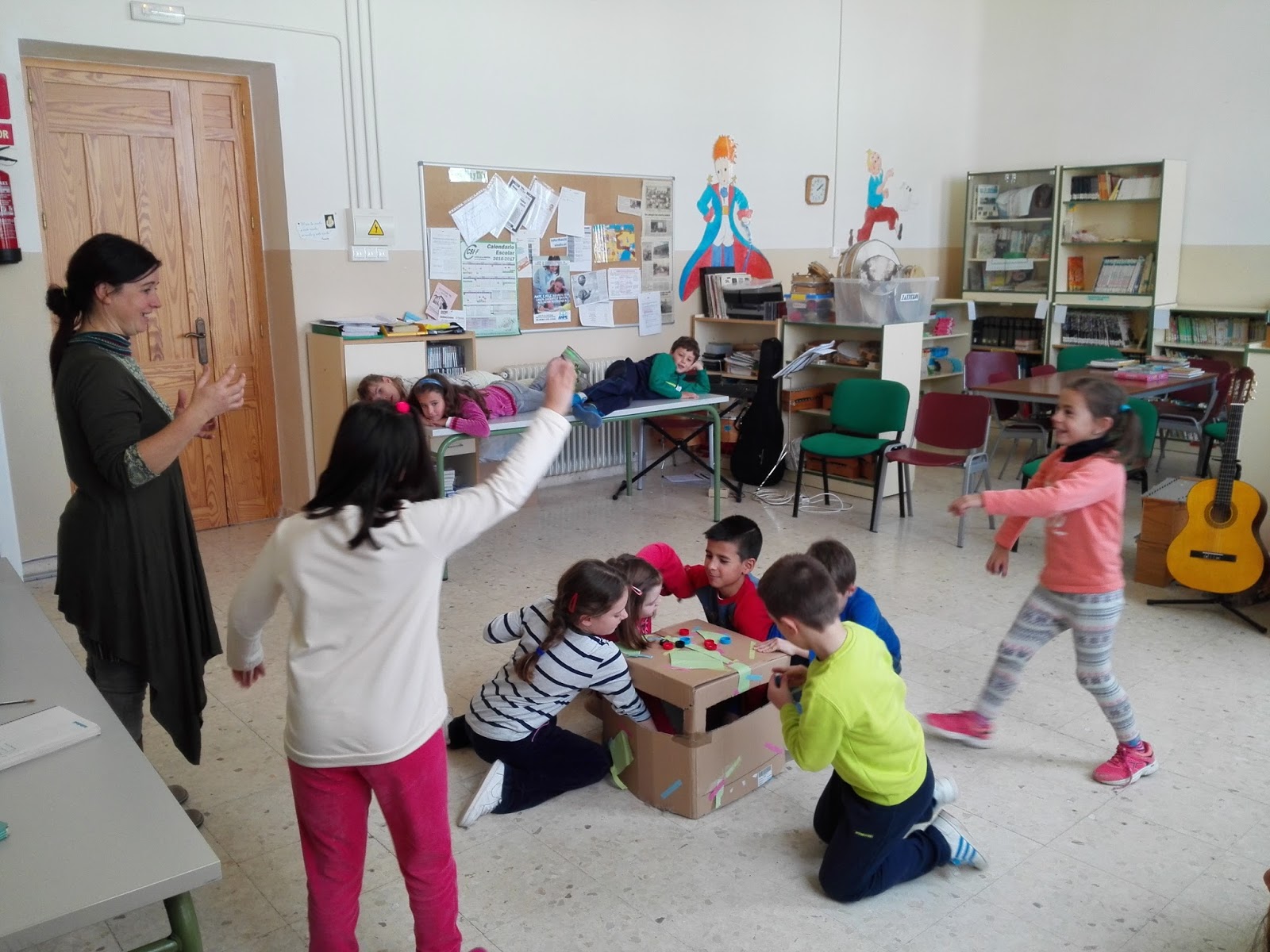 Jugamos hasta dejar los materiales hechos un higo con los/as alumnos/as de 3º a 6º curso. Vinieron con mucha energía, pero alguno tuvo que pasar un «tiempo de reposo en el hospital de campaña» que se organizó en la sala de profesores (era parte del juego), ya que se propusieron situaciones muy diversas: tenemos por costumbre ir al colegio en coche, aunque vivimos a 2 minutos, el vecino se deja el tractor en marcha justo debajo de mi ventana, hay un atasco y accidente en la puerta porque llueve y venimos todos en coche, etc.